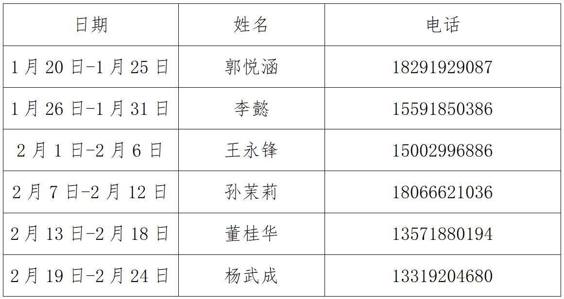 根据《关于2023-2024学年寒假放假安排的通知》文件精神,寒假放假时间为2024年1月20日至2024年2月24日,放假期间,开云kaiyun官方网站值班安排如下: