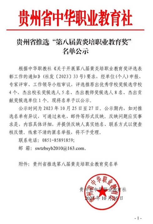 10月25日,贵州省中华职业教育社公布推选第八届黄炎培职业教育奖名单,beat365成功入选第八届黄炎培职业教育奖“优秀学校奖”候选学校。