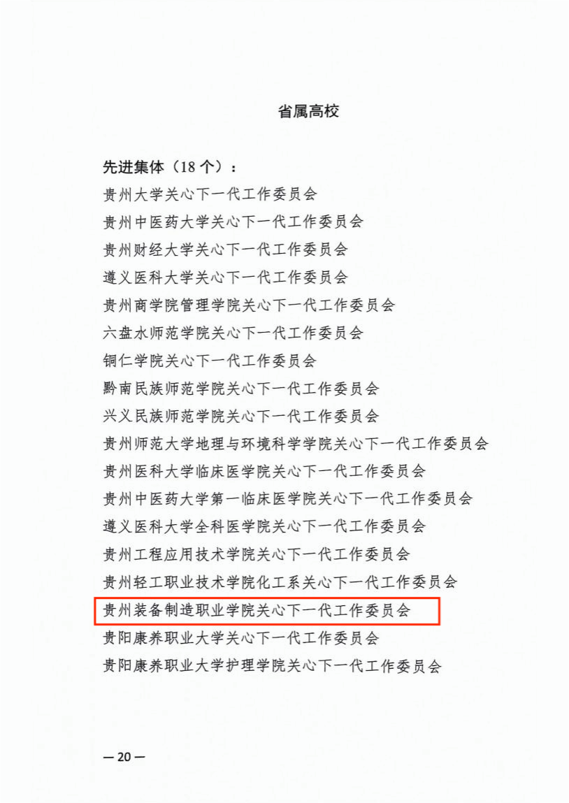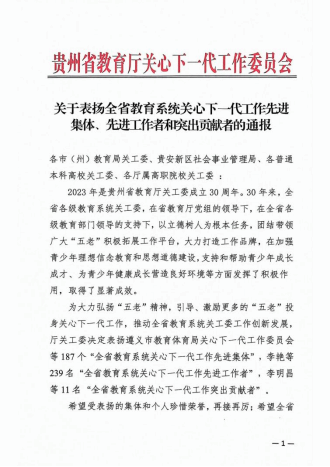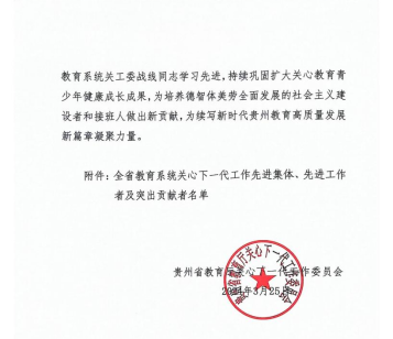 近日,贵州省教育厅关心下一代工作委员会对全省教育系统关工委一批做出突出成绩的先进集体和个人进行了评选表彰,学院关心下一代工作委员会被授予“贵州省教育系统关心下一代工作先进集体”荣誉称号,学院关工委办公室主任孙文获得“贵州省教育系统关心下一代工作先进工作者”荣誉称号。