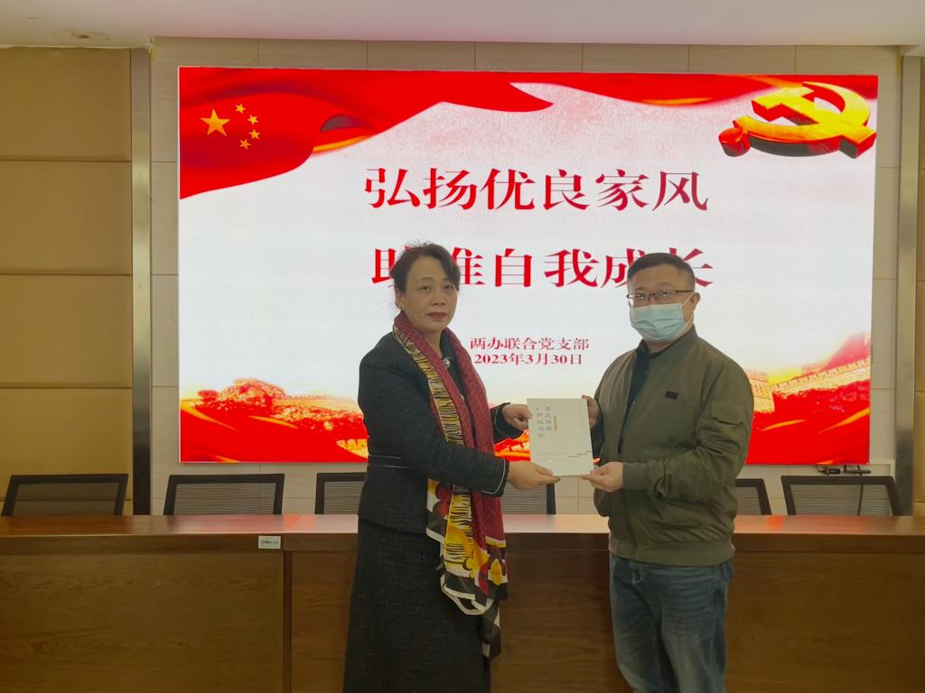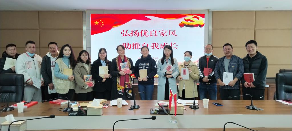 最后,学院党委书记熊星同志和支部书记周芸同志给支部党员及群众赠送家风系列从书,以此鼓励和激励大家读好书,用好书,在推动学校事业发展的同时,也推动个人家庭的健康发展。
