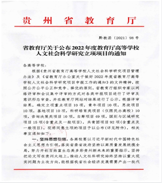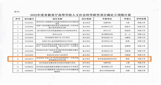 近日,贵州省教育厅公布了2022年省教育厅人文社会科学研究项目申报结果,我院党委书记熊星同志主持的《职业院校“忠诚工匠”培养体系构建研究--以beat365在线体育官网登录入口为例》获重点项目立项。本项目是省教育厅遴选立项的10个重点项目中唯一一个由高职院校承担的科研项目,实现了我院在人文社会科学项目中零的重大突破。
