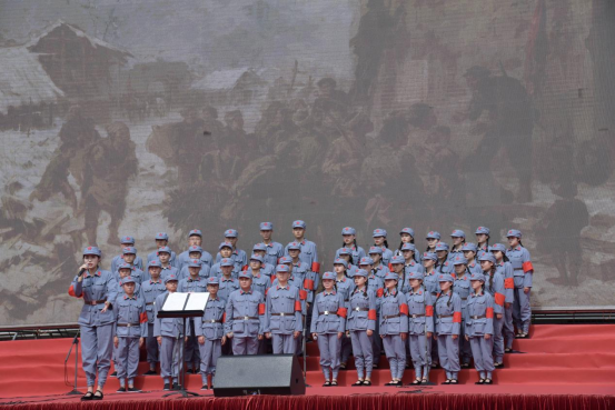 整场演出按照红军长征的时间顺序推进,以领唱、合唱的形式演唱了《长征组歌》十首歌曲,营造出浓厚的年代氛围,带领师生重走长征路。演出在一曲《告别》中拉开帷幕,沉吟悠扬、铿锵有力的歌声将“子弟兵别故乡,急切踏上征途”依依惜别又意志坚定的拳拳之心化作必胜的信念。在演唱《突 破 封 锁 线》时而急促低沉,时而铿锵有力的歌声再现了“红军昼夜飞行军,突破围追堵截”的军情紧急,嘹亮的歌声回荡在演出现场。