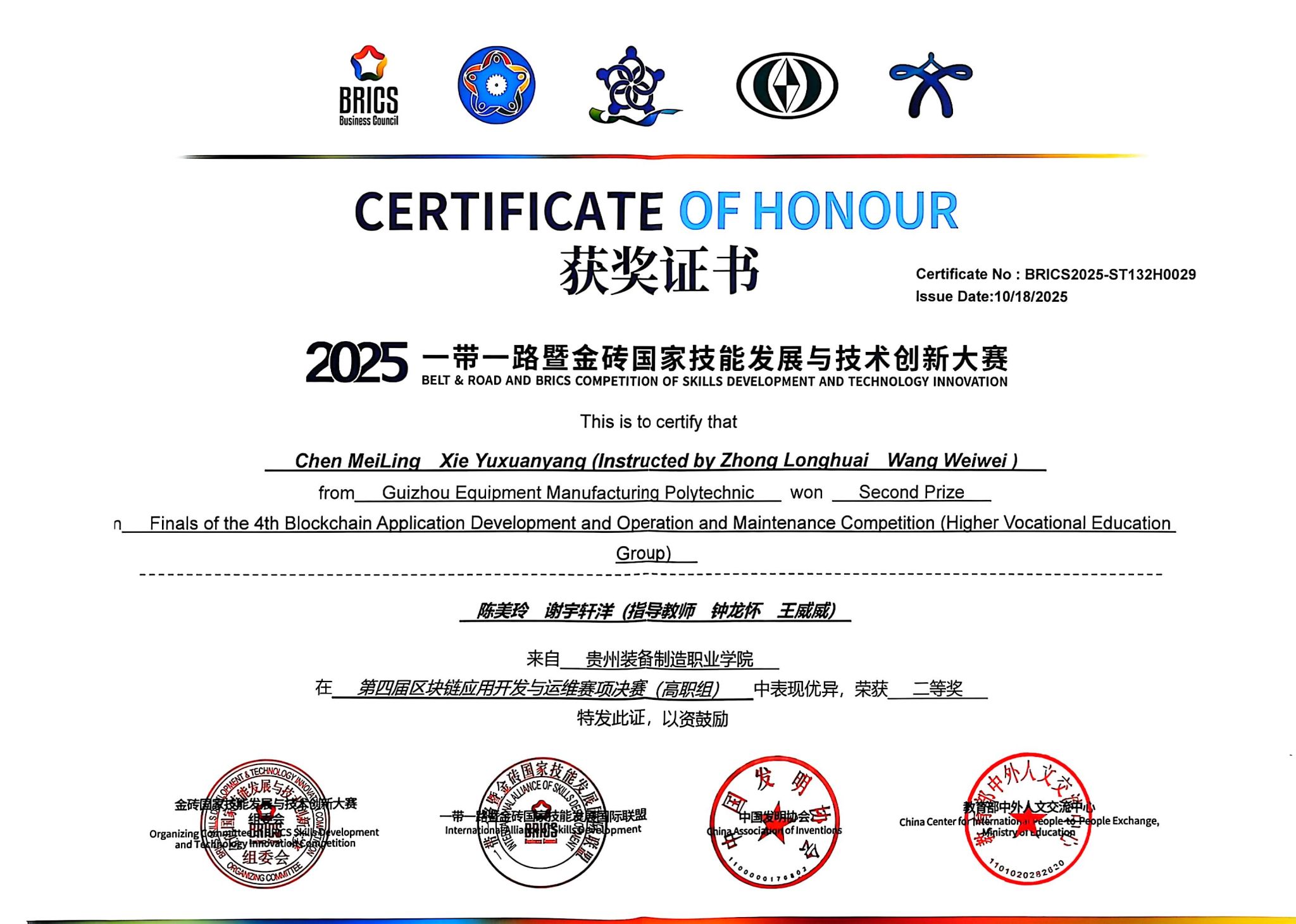 10月18日,2025一带一路暨金砖国家技能发展与技术创新大赛区块链应用开发与运维赛项全国总决赛落下帷幕。beat365学子在比赛中表现出色,由龙权、王海军老师指导的团队荣获金奖,钟龙怀、王威威老师指导的团队斩获银奖。