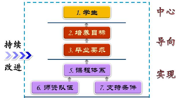 认证标准各项指标的逻辑关系为:以学生为中心,以培养目标和毕业要求为导向,通过足够的师资队伍和完备的支持条件保证各类课程教学的有效实施,并通过完善的内外部质量保障机制保证质量的持续改进和提升,最终使学生培养质量满足要求。