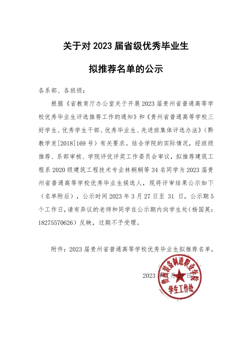 关于对 2023 届省级优秀毕业生拟推荐名单的公示