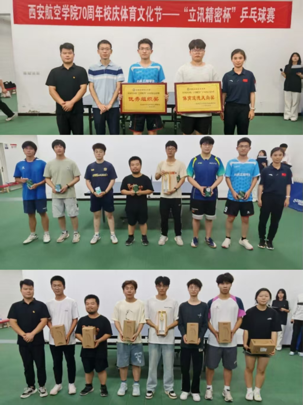 颁奖时刻,荣耀绽放!“优秀组织奖”、“体育道德风尚奖”等荣誉逐一揭晓,获奖团队与个人手持奖牌、奖杯,定格下校园体育的高光瞬间。从赛场上的全力挥拍,到领奖时的自信微笑,每一位参与者都用汗水书写着对乒乓球运动的热爱,更彰显了西航学子团结协作、追求卓越的精神风貌。这场赛事不仅是技艺的较量,更是校园文化的生动实践,立讯精密乒乓球体育赛事,与学校携手培育全面发展的新时代青年。