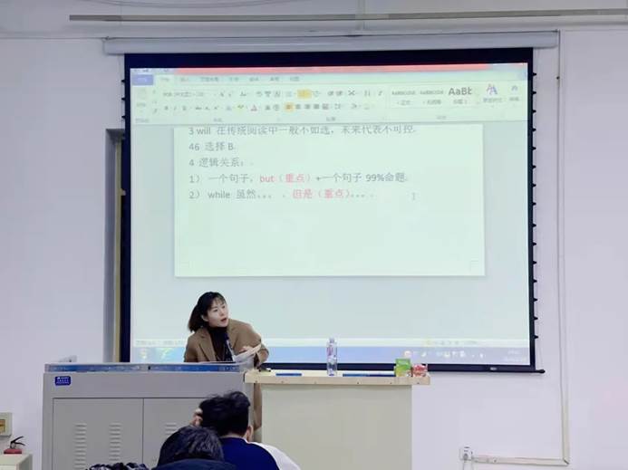 为帮助2018级、2019级的同学们找到准确、有效的英语学习方法,顺利通过英语四六级考试。我院于12月8日晚七点在阶梯五教室为2018级、2019级备考四六级的同学们开展英语四六级指导课讲座,特邀了新文道考研李洁老师,我院2018级、2019级全体学生参加。