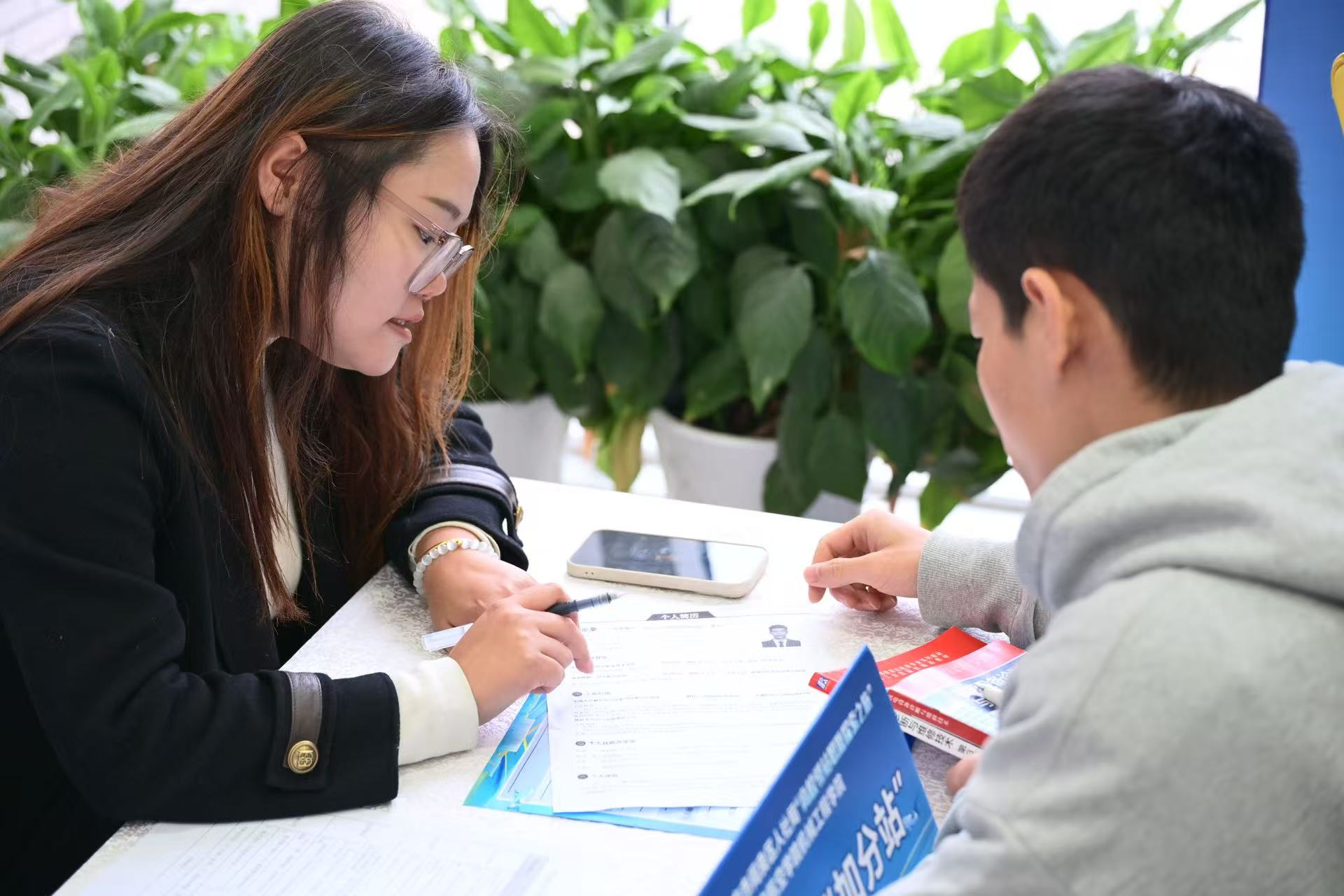 最后是政策“快问快答”环节,桌上摆放“大学生就业政策题卡”,志愿者随机抽取2道题,学生答对1道即可盖章,若暂时答不上,志愿者也会现场详细讲解政策。在闯关中,学生若有职业困惑,可随时前往导师指导区,获得一对一的专业解答。