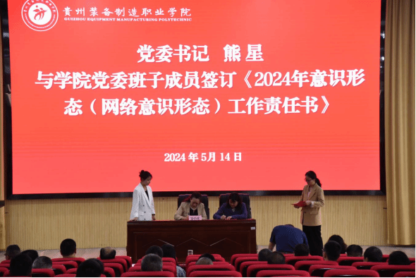 在会上,党委书记熊星同志与党委班子成员签订了责任书,各党委委员与分管部门和系部负责同志签订了责任书。责任书的签订对干部、教师进一步提高政治站位、筑牢意识形态安全防线、履行“一岗双责”提供遵循。