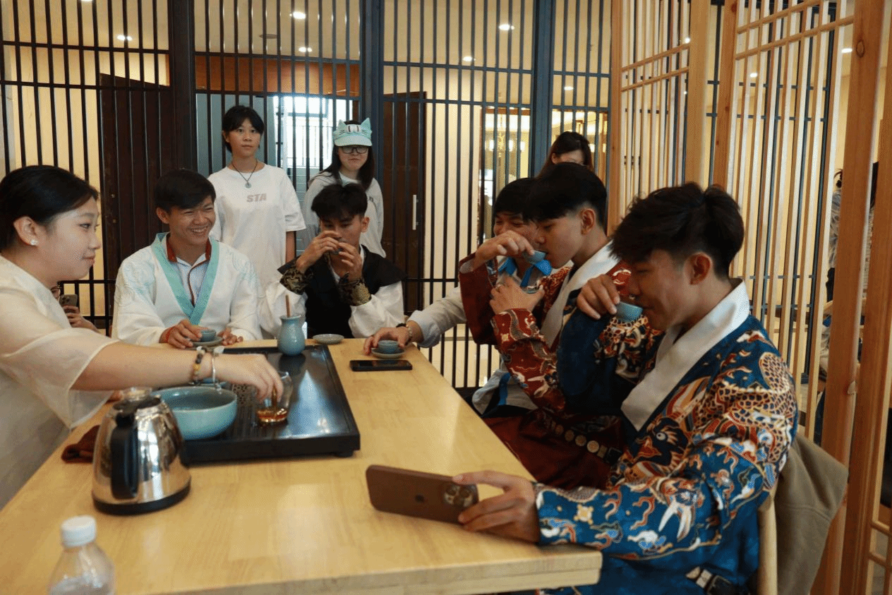 文化体验环节同样精彩纷呈。在汉服、茶艺体验活动中,柬埔寨师生身着雅致汉服,在茶香氤氲中聆听茶艺知识讲解、观看传统茶礼仪展示,亲手参与茶艺实操,沉浸于东方传统生活美学的雅致氛围中,感受中华文化的独特韵味。