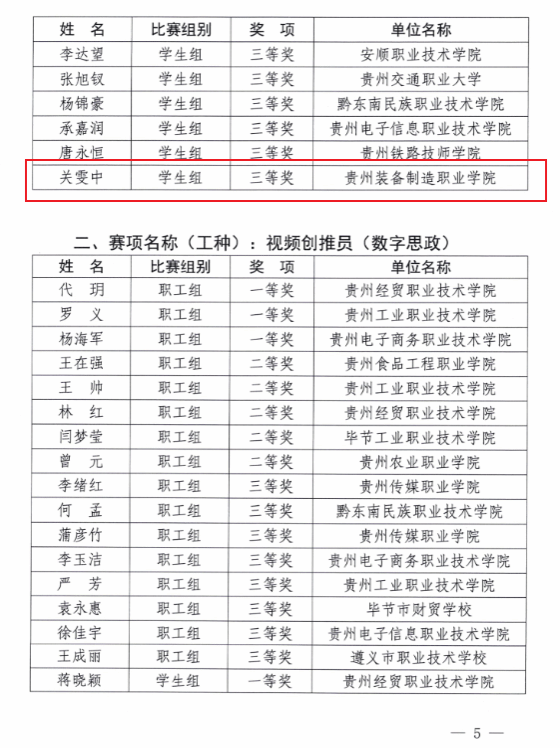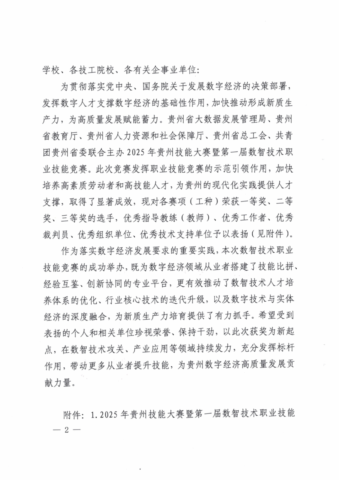 在贵州省大数据发展管理局、教育厅、人力资源和社会保障厅、总工会、共青团贵州省委五部门联合主办的“2025年贵州技能大赛暨第一届数智技术职业技能竞赛”中,我院师生团结协作、奋勇拼搏,凭借出色的专业能力与创新表现,在比赛中脱颖而出,荣获多项优异成绩,展现了学院良好的育人成效与师生昂扬的精神风貌