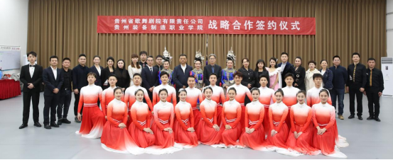 在与会领导和嘉宾的见证下,学院党委书记熊星与贵州省歌舞剧院副院长尚子钧共同签订战略合作协议,双方将进一步充分发挥艺术育人功效,促进校园文化艺术高质量发展,推进三全育人工作迈上新台阶。