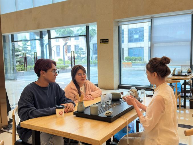 随后,所有同学穿着汉服体验中国茶文化。经济管理系同学们向新加坡南理学院的师生介绍了茶文化,现并场展示泡茶技艺,品鉴了绿茶、红茶。在品茶过程中,大家一起交流茶文化,表达了此次活动的期望与憧憬,以及对中国文化和贵州地区的热爱。