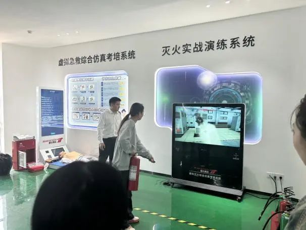 如遇火灾时,最主要的是不要慌张,及时拨打119,有逃生条件的,使用逃生楼梯及时离开火场。如果情况不好,要用湿毛巾捂住口鼻,火势过大时用湿毛巾或衣物堵住门缝,切不可直接开门逃生。然后张老师又教我们判别灭火器的结构和如何正确辨别灭火器的正常状态。一般情况下,灭火器上的箭头是在绿色格子上时表示灭火器能够正常使用,红色的时候是表示灭火器失效,黄色时表示灭火器压力不足。使用灭火器前,要先将灭火器上下颠倒摇晃,拔掉保险栓,进行灭火。张老师带领师生在旁边的模拟设备进行操作指导。同学们跃跃欲试地上台,在张老师的指导下圆满完成灭火演练。后续张老师还指导同学们穿戴高空作业防护器具完成高空作业体验。