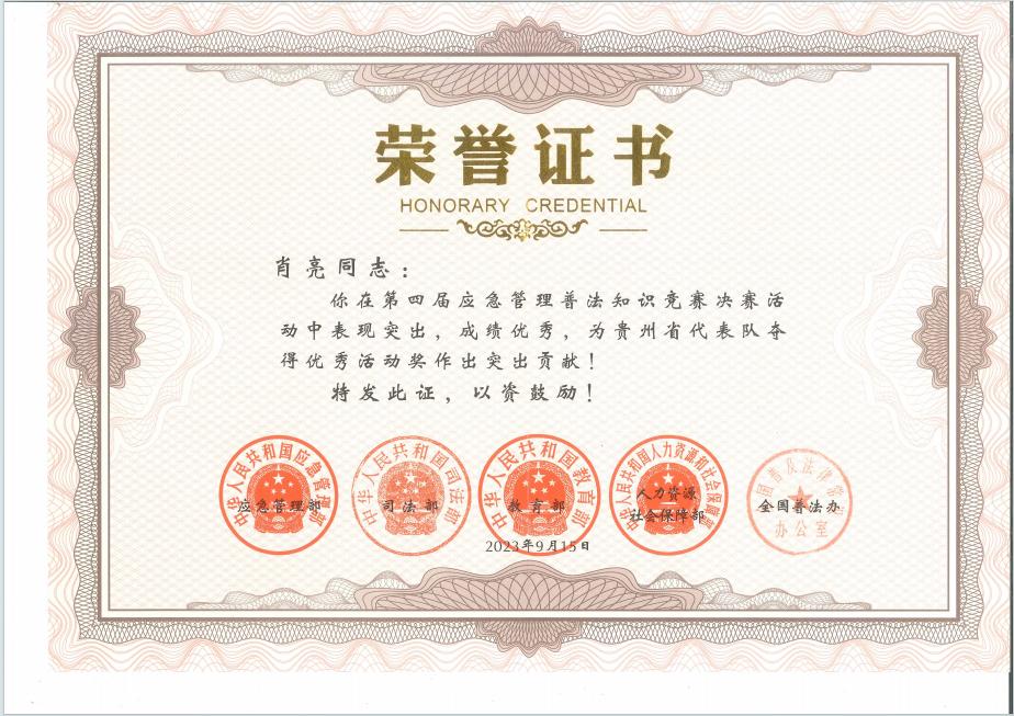 为全面贯彻落实党的二十大精神,深入学习宣传习近平法治思想,按照全国“八五”普法规划和全国应急管理系统“八五”普法规划工作部署,在2023年,由应急管理部、司法部、教育部、人力资源社会保障部、全国普法共同组织开展的全国第四届应急管理普法知识竞赛中,通过层层选拔,贵州省代表队与其他9支省代表队伍获得决赛资格。经过激烈比拼,学院机械工程系的肖亮同学荣获“优秀活动奖”,学院荣获“优秀组织单位”。
