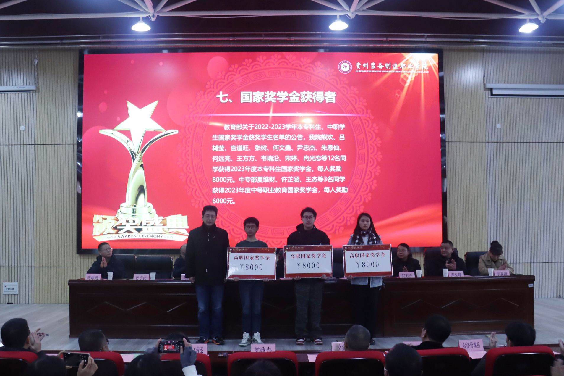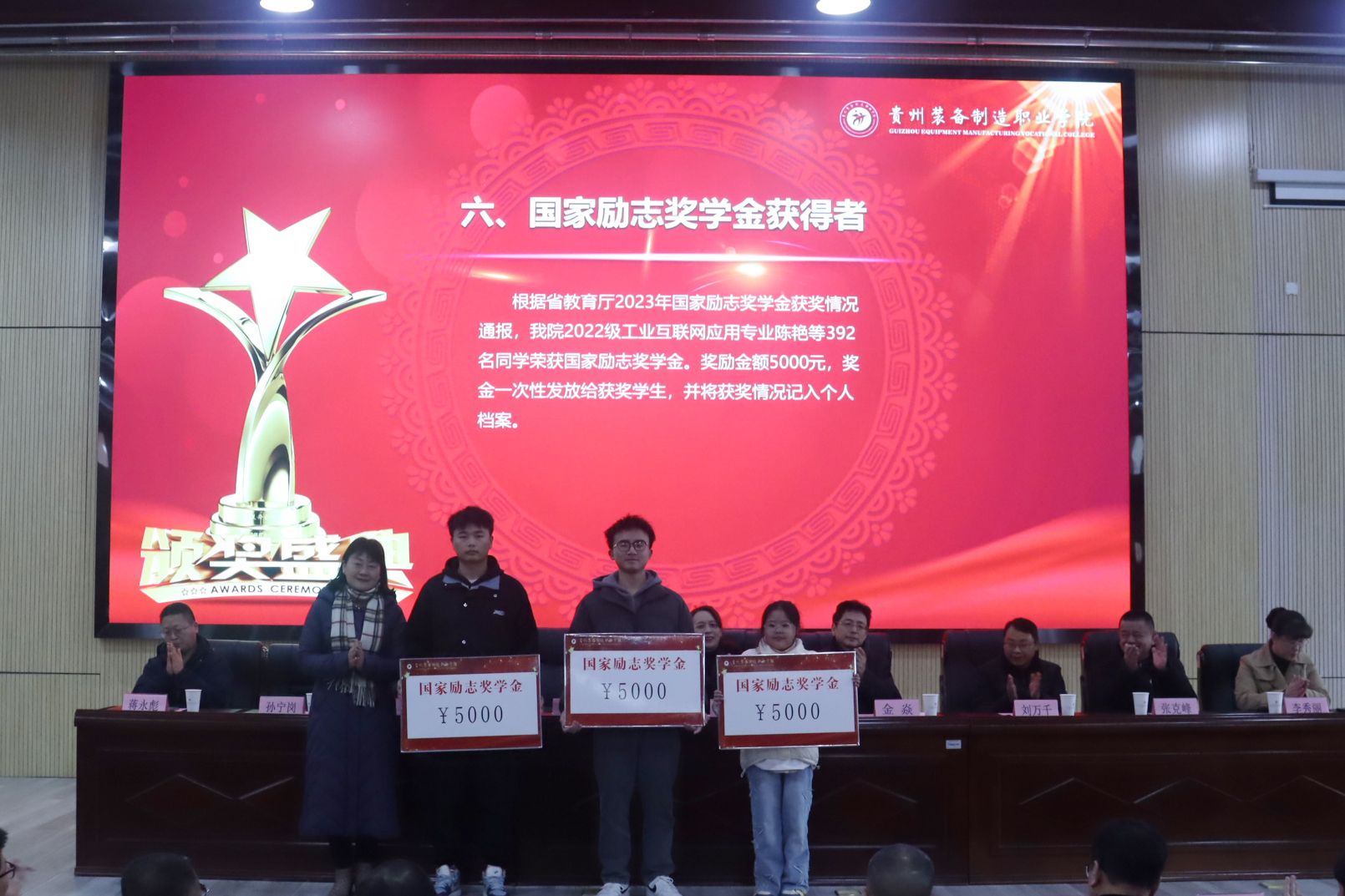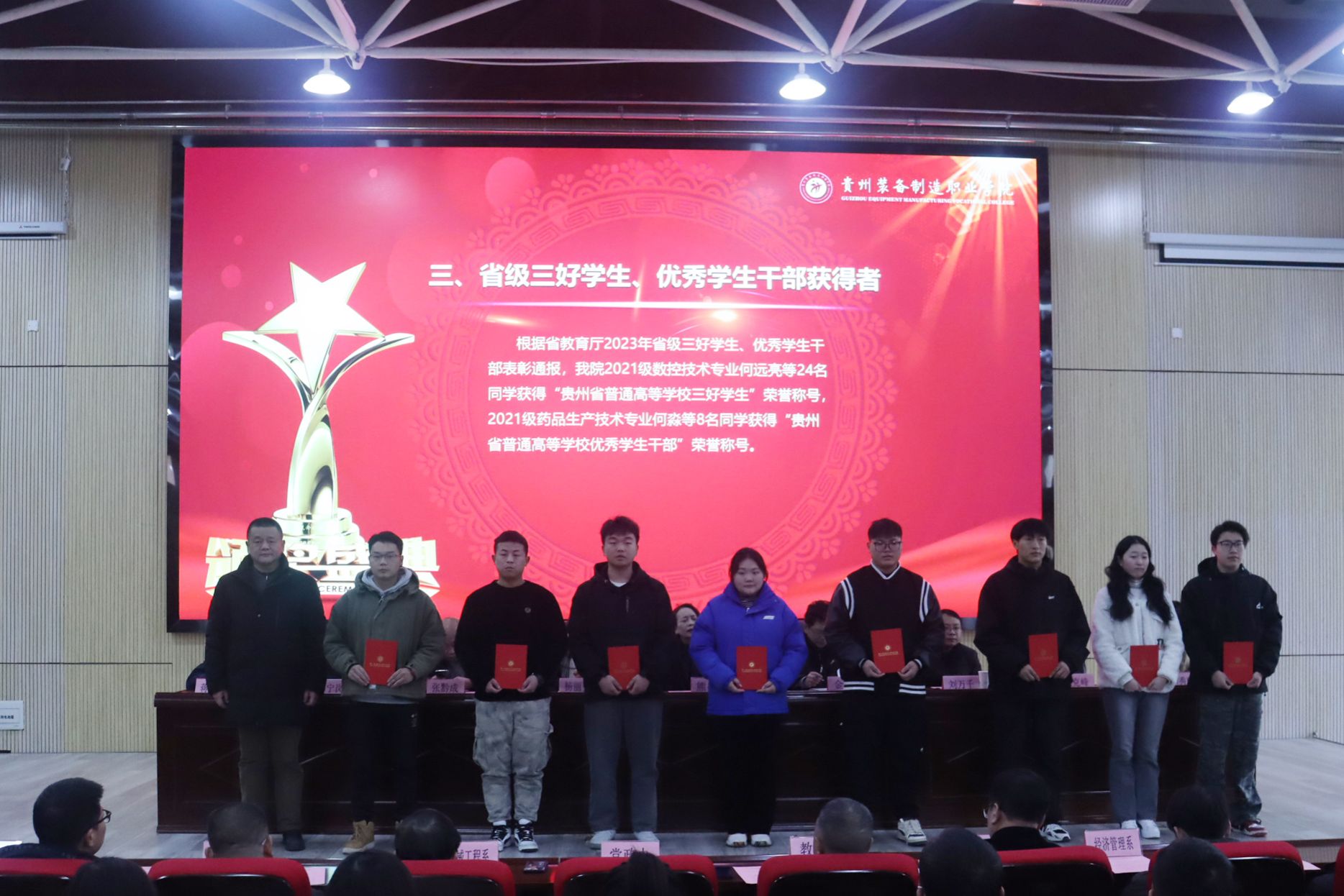 为表彰先进,树立典型,营造学院团结奋进、争优创先、勇攀高峰的浓厚氛围,展现学校子奋发有为、拼搏进取的良好风貌。2023年12月19日,学院2023年度优秀学生表彰暨“一站式”新青年学生社区寝室长培训大会在学院德润楼101报告厅隆重举行。学院党委书记熊星、党委副书记、院长金焱,党委副书记杨丽芳、党委委员、纪委书记刘万千,党委委员、副院长张黔成、张克峰、李秀丽,党委委员、宣传统战部部长蒋永彪出席了表彰大会并为获奖学生代表颁奖。各相关职能部门,各系部党总支书记、副书记、学生科科长、全体辅导员、获奖学生代表和寝室长代表近500余人参加了大会。院长金焱在大会上讲话。大会由党委委员、副院长孙宁岗主持。大会在庄严的国歌声中拉开序幕。首先由孙宁岗副院长通报了学院2023年度在国家级、省级技能大赛、第十八届挑战杯大赛、第九届互联网+创新创业大赛情况,逐一宣读了国家级、省级、院级获得奖学金、三好学生、优秀学生干部、先进班级集体等各项表彰文件。学院党委领导班子成员逐一为获奖学生代表颁奖。2023年度beat365在国家级技能大赛共有55名学生获奖,其中一等奖4项、二等奖3项、三等奖9项,机械工程系王秀木同学被授予“全国技术能手”“西部技能之星”荣誉称号,并入选第47届世界技能大赛国家集训队。省级技能大赛共有390人次获奖,其中一等奖16个、二等奖 14个、三等奖23个。12人获得国家奖学金、392人获得国家励志奖学金获得者,24人获得省级三好学生、8人获得优秀学生干部、4个班级获得先进班集体。共评选、表彰了院级三好学生424人)、优秀学生干部366人、先进班集体27个和827人获得忠诚工匠奖学金。