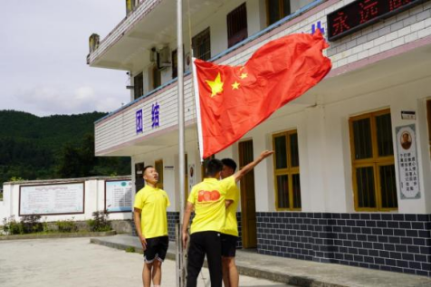 启动仪式开始,升国旗、凑唱国歌。由本次“三下乡”实践活动阳光服务队的郭家兵、周文杰、张小培同学组成的旗手进行了升旗。