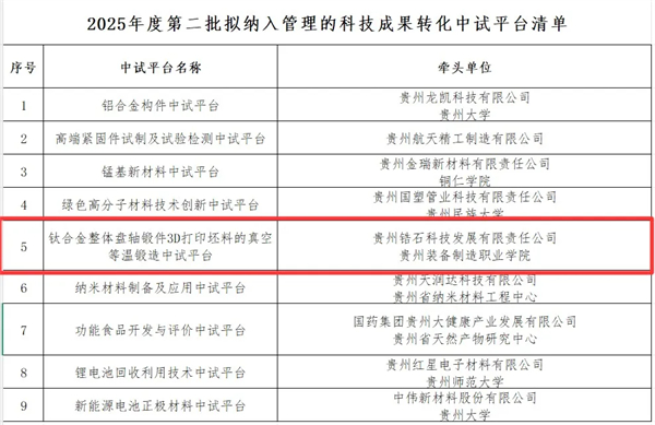 中试平台作为贵安清镇职教城打造科创高地的重要载体,也是连接高校、科研机构与企业的重要载体,通过模拟真实生产环境对科技成果进行验证,解决实验室成果向产业化转化的“最后一公里”问题,可有效降低产业化风险,为新兴产业提供关键支撑,推动创新资源向下对接企业需求,向上集聚高端创新要素,形成协同创新机制。此次平台成功入选,将有力推动3D打印技术与精密锻造技术在钛合金制造领域的深度融合,为钛合金近净成形技术带来更多的创新和突破!