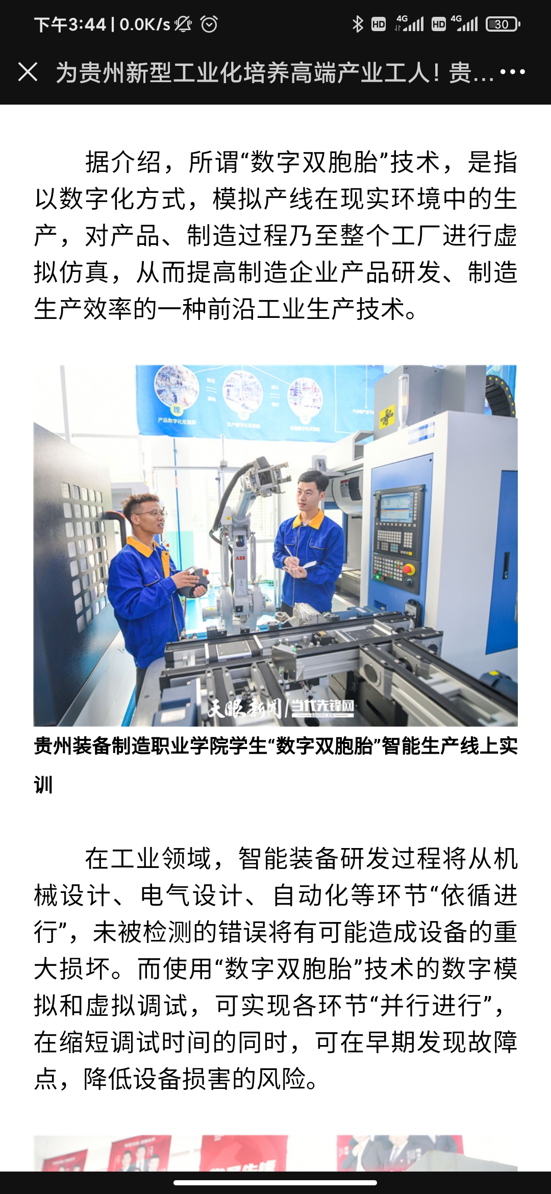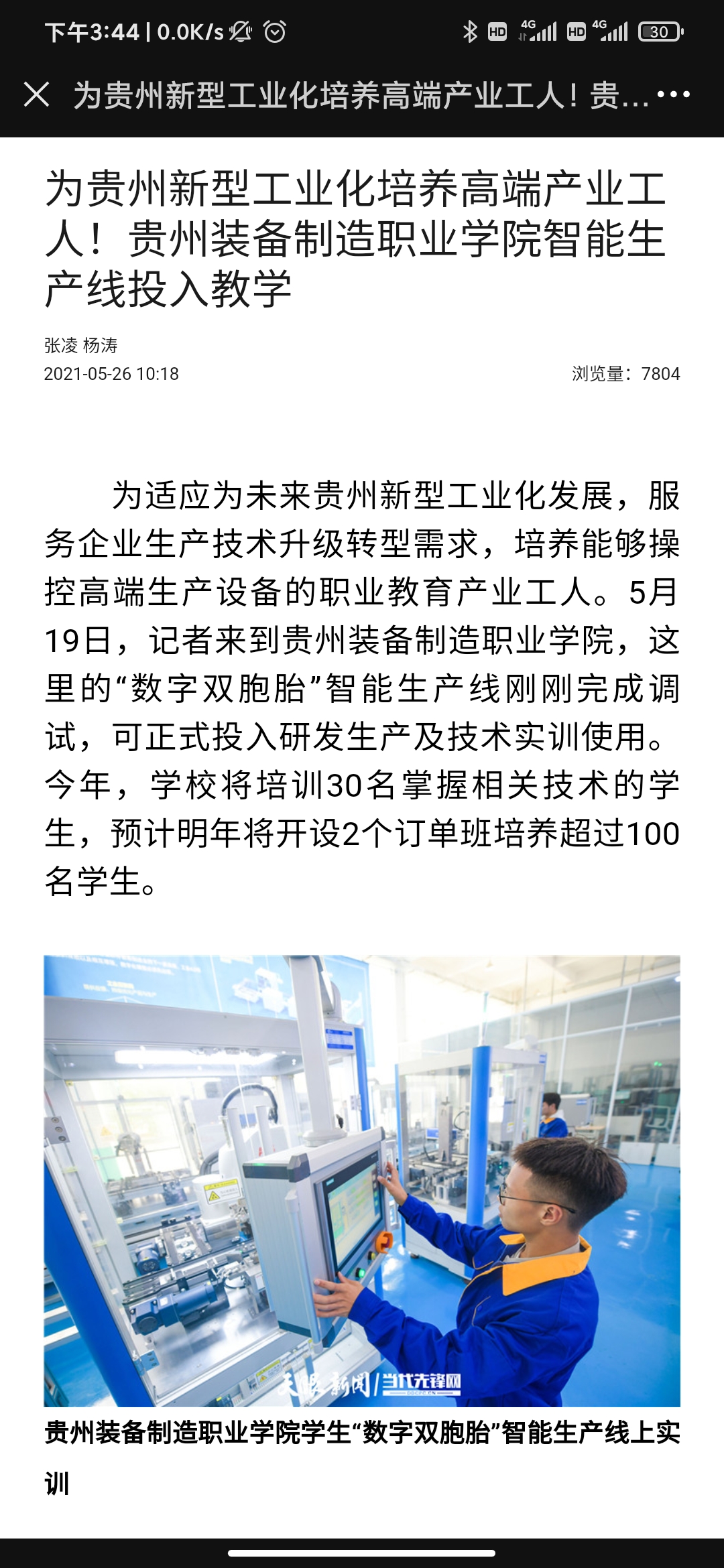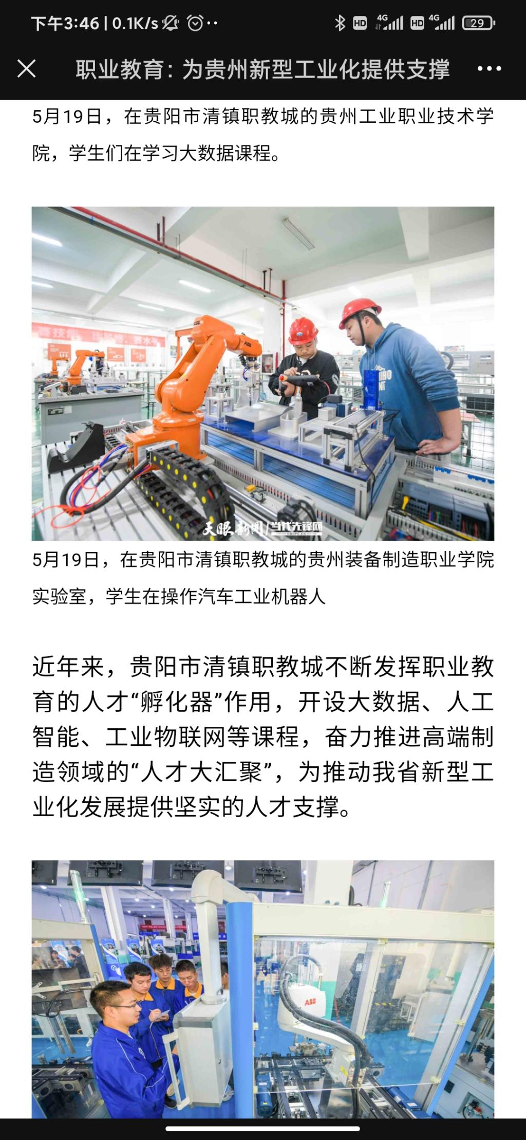 2021年5月26日,天眼新闻以《为贵州新型工业化培养高端产业工人!beat365在线体育官网登录入口智能生产线投入教学》为题,全文报道了学院职业教育专业建设、人才培养等内容;2021年5月20日,天眼新闻《职业教育:为贵州新型工业化提供支撑》以图片为重点关注了学院职业教育的发展。