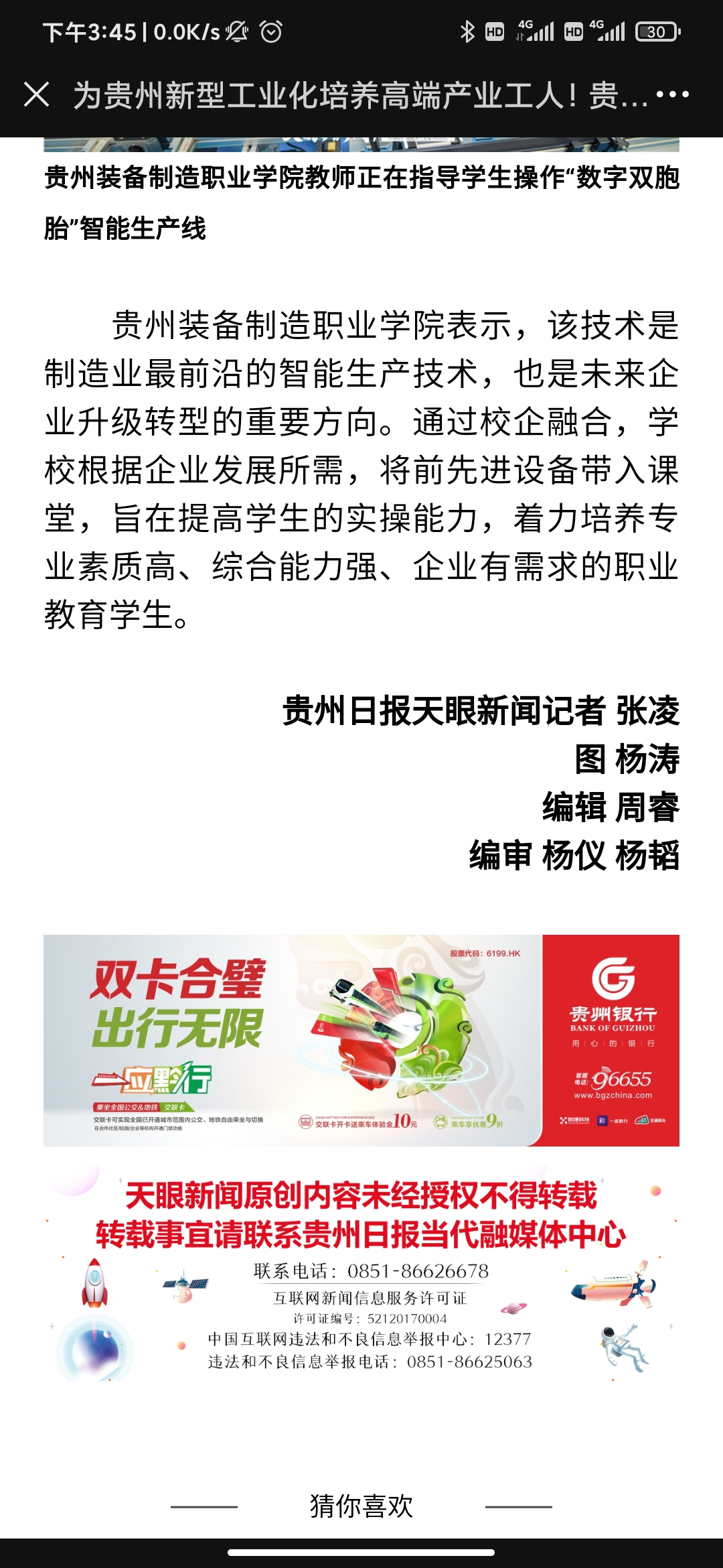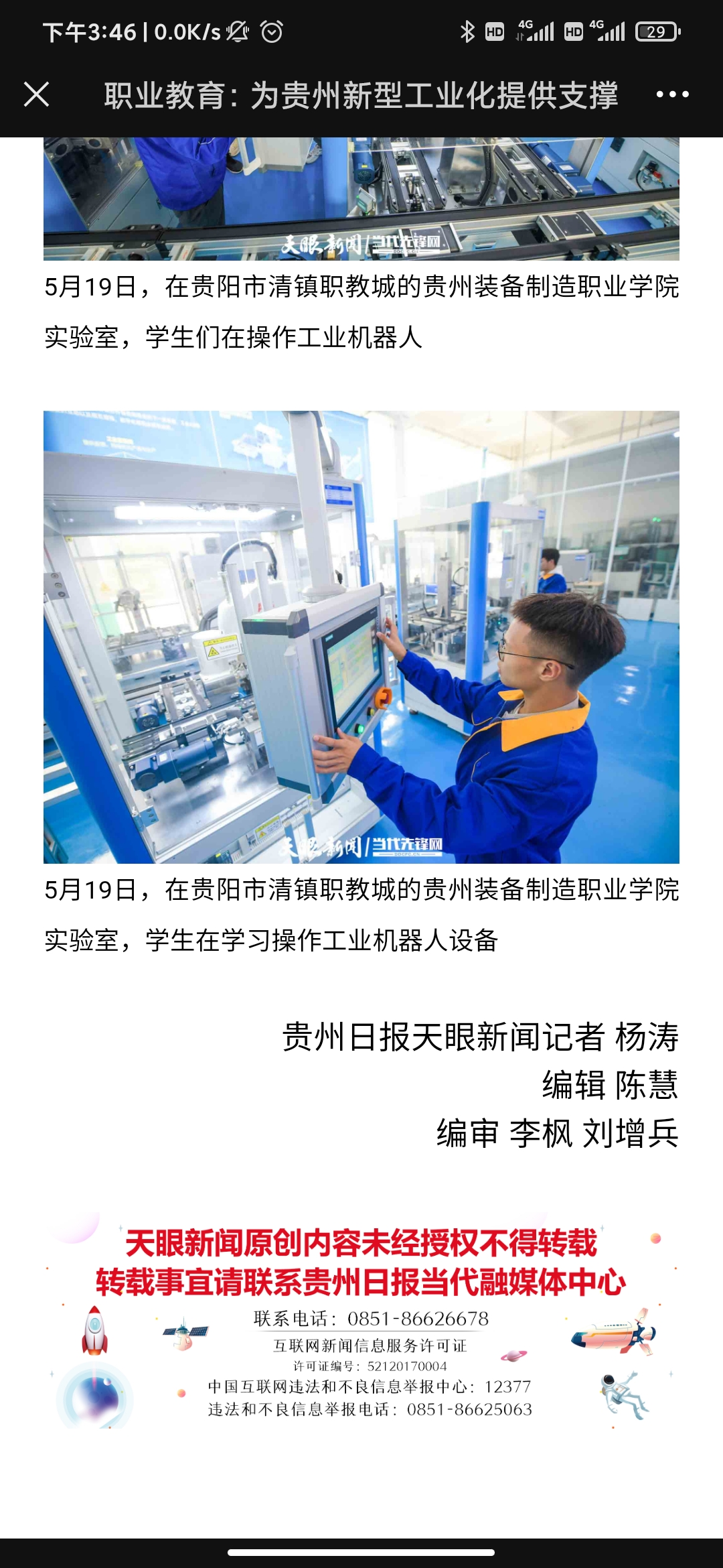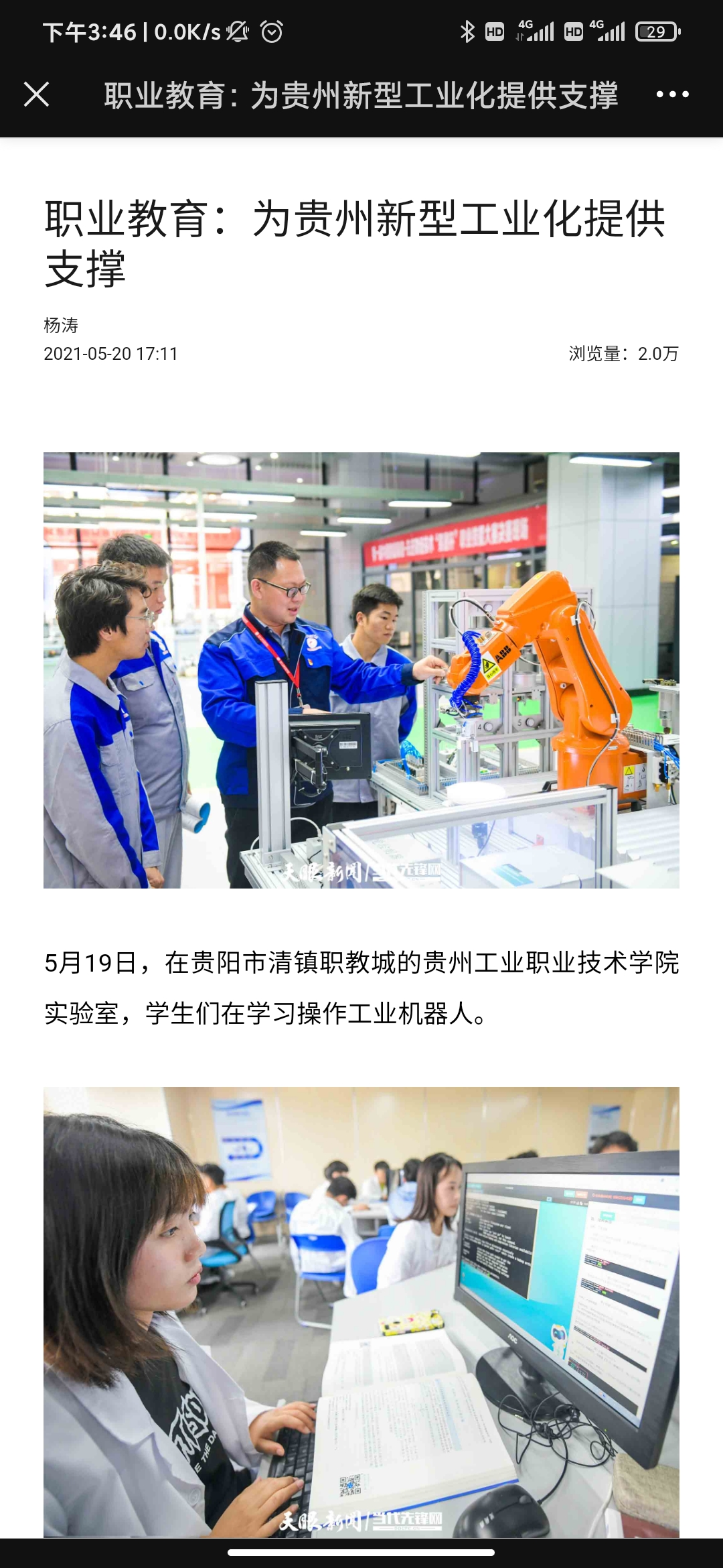 2021年5月26日,天眼新闻以《为贵州新型工业化培养高端产业工人!beat365在线体育官网登录入口智能生产线投入教学》为题,全文报道了学院职业教育专业建设、人才培养等内容;2021年5月20日,天眼新闻《职业教育:为贵州新型工业化提供支撑》以图片为重点关注了学院职业教育的发展。