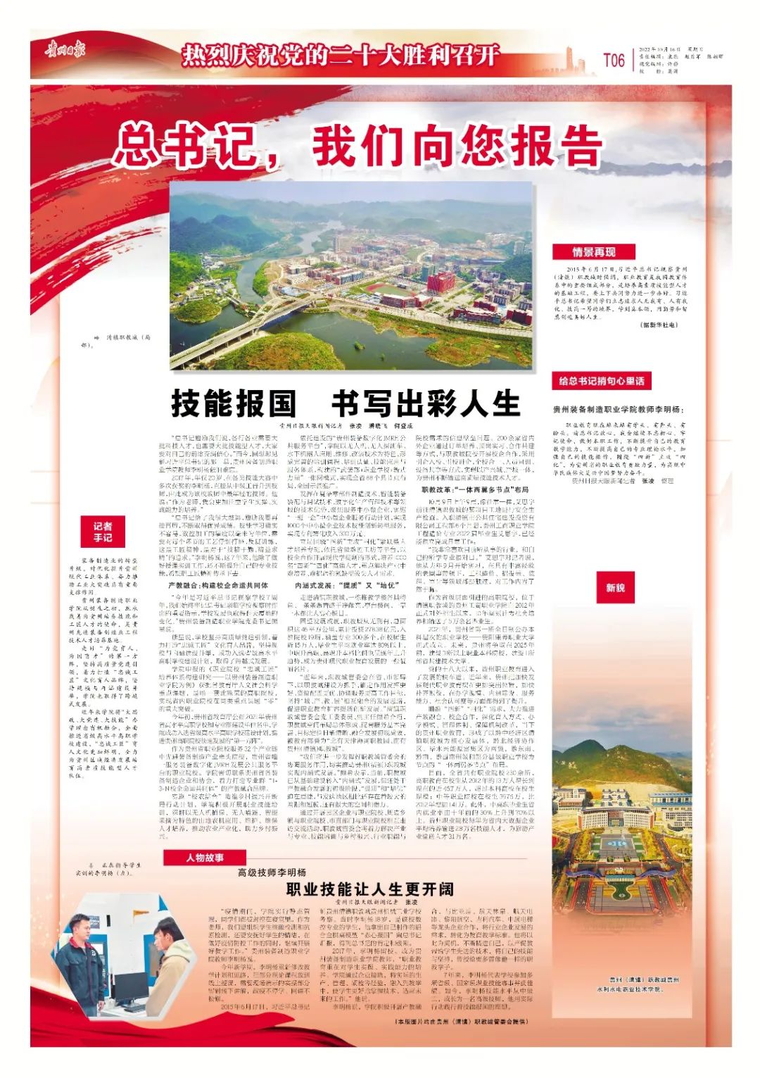 2015年6月17日,习近平总书记视察贵州(清镇)职教城时强调,职业教育是我国教育体系中的重要组成部分,是培养高素质技能型人才的基础工程,要上下共同努力进一步办好。习近平总书记希望同学们立志追求人无我有、人有我优、技高一筹的境界,学到真本领,用勤劳和智慧创造美好人生。
