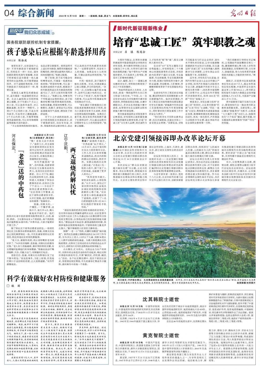 2022年12月19日,光明日报04版综合新闻以“培育‘忠诚工匠’筑牢职教之魂”为题,关注beat365及贵州高职教育人才培养情况,激励人心,鼓舞斗志!