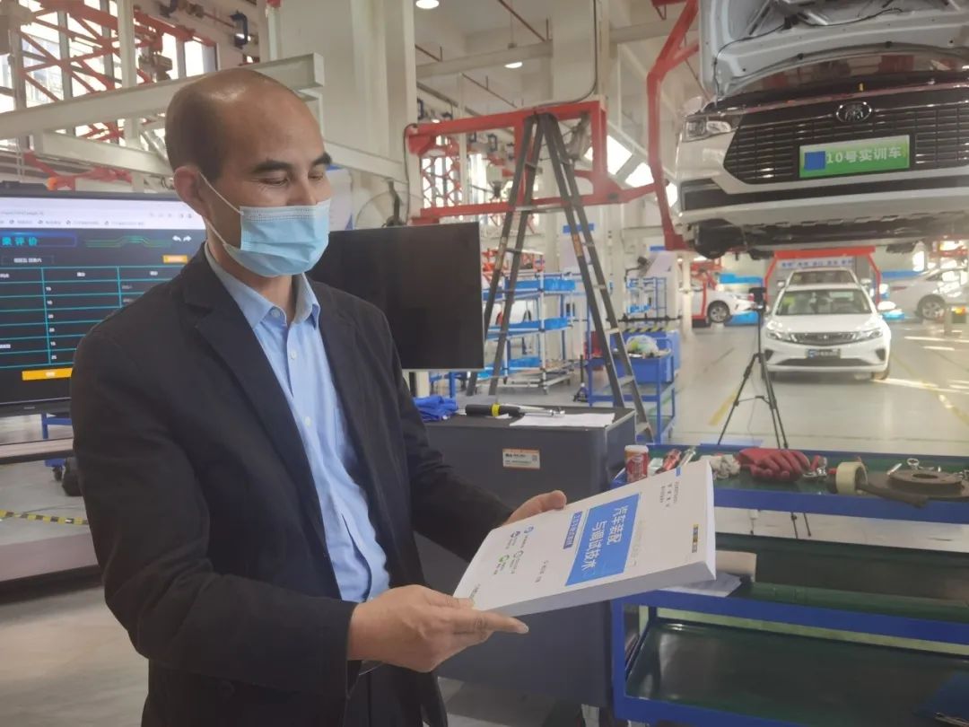 汽车工程系主任杨正荣和他自编的新能源汽车教材