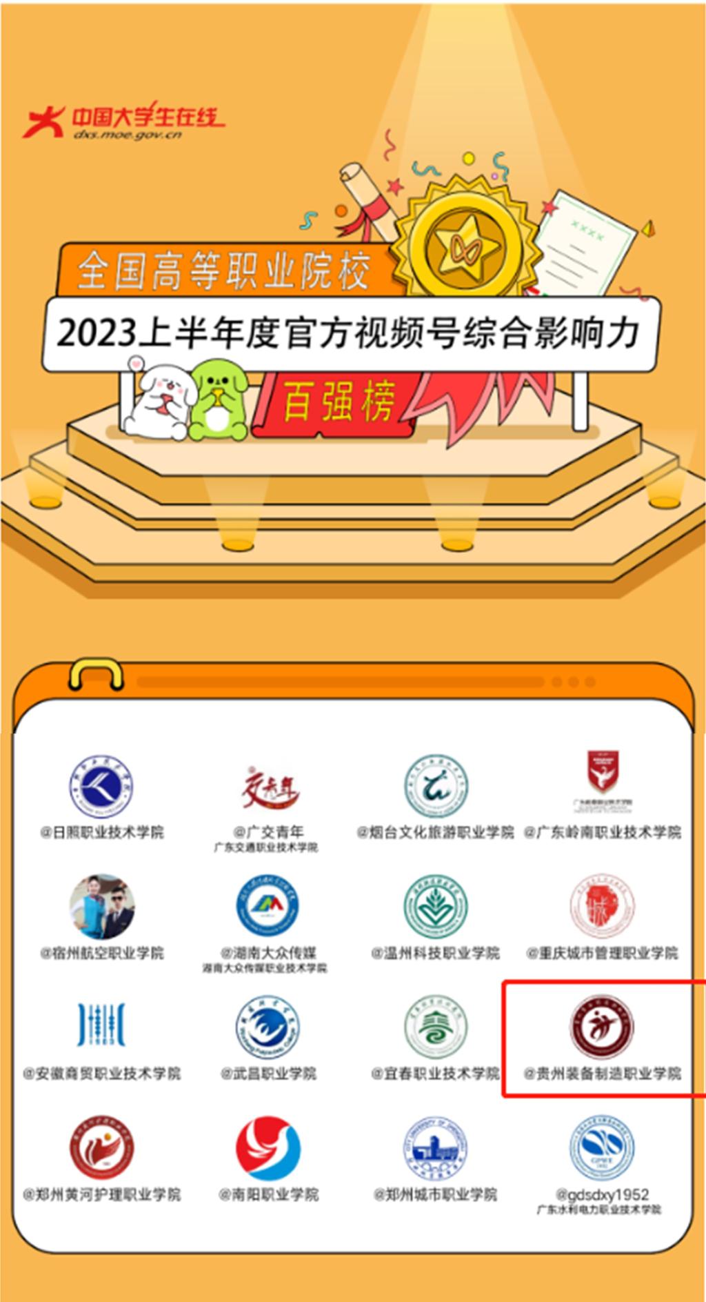 喜报丨beat365在线体育官网登录入口荣登“全国高等职业院校2023上半年度官方视频号综合影响力百强榜”
